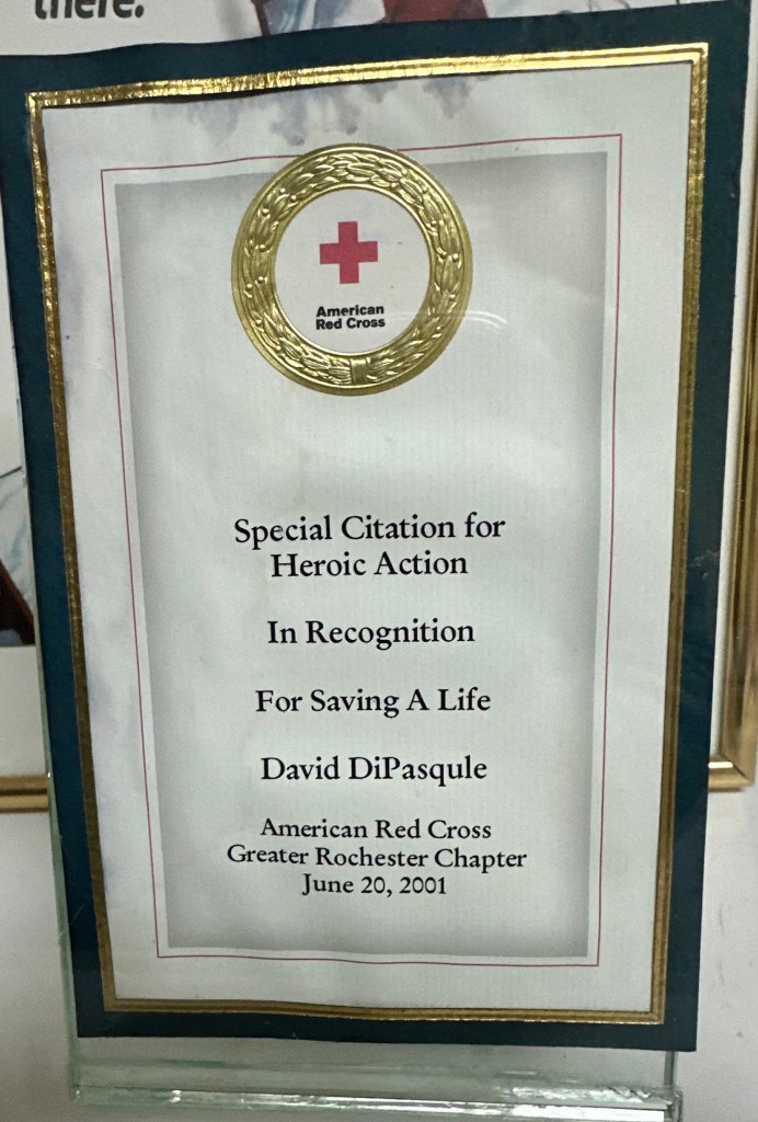 Remarkably, December 20 was not the first time David saved a life. In 2001, an elderly person at the Greater Rochester International Airport got off an elevator, put his back against a wall and collapsed. “We didn’t have AED’s at the time” and so David performed CPR compressions and saved the man’s life. At the hospital, the man thanked David for saving his life and joked about his ribs hurting.